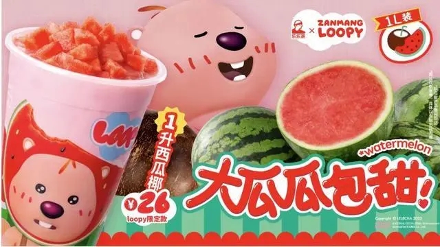 今年5月,乐乐茶联名韩国动画“女明星”Loopy,推出粉红色的“西瓜椰”,还同步上线贴纸、扇子、限定手袋、联名毛绒镜挂件等周边,恰到好处拿捏住“外表成熟、内心可爱”的年轻人,上新当天就冲上了微博热搜。