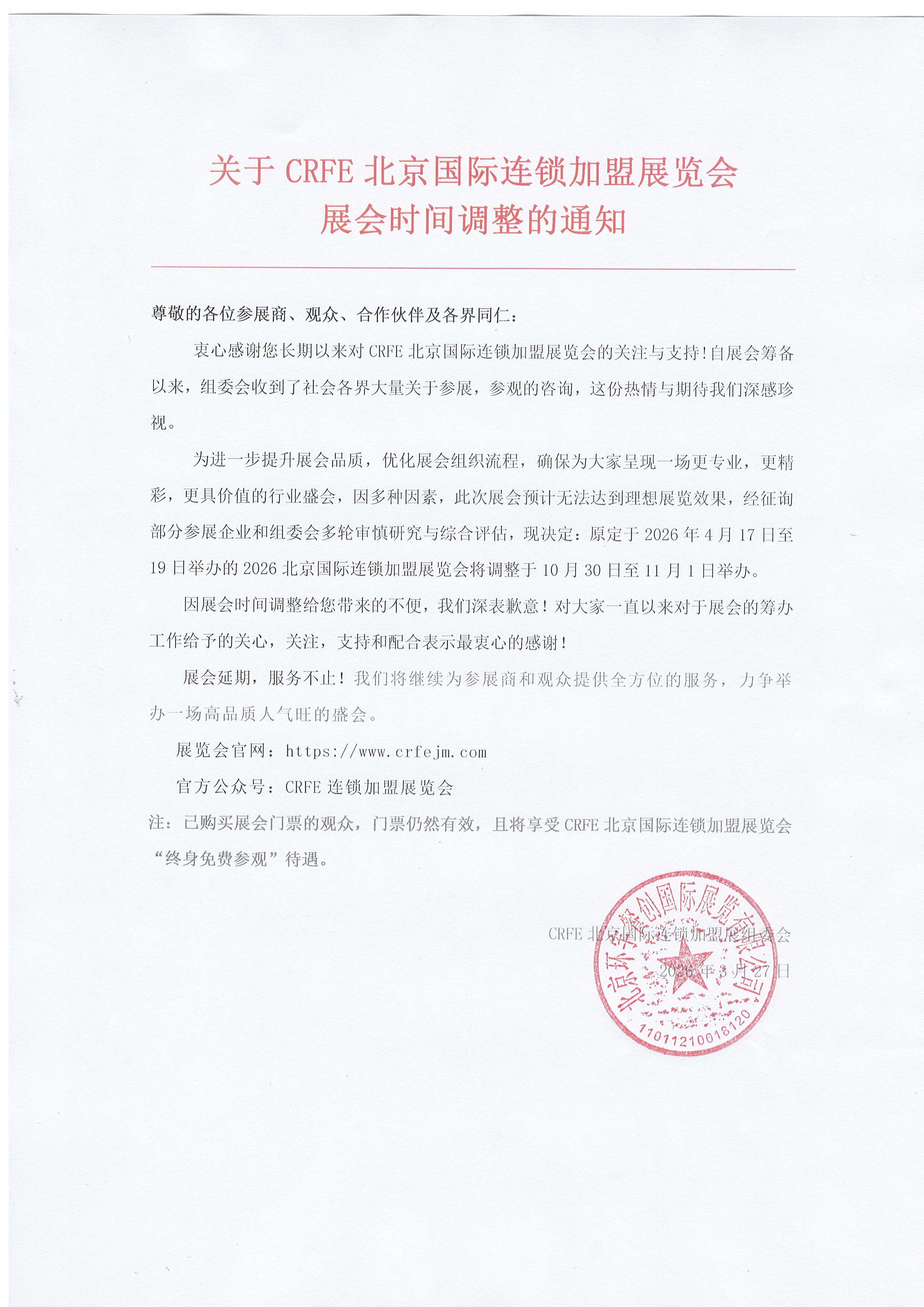 为进一步提升展会品质,优化展会组织流程,确保为大家呈现一场更专业,更精彩,更具价值的行业盛会,因多种因素,此次展会预计无法达到理想展览效果,经征询部分参展企业和组委会多轮审慎研究与综合评估,现决定:原定于2026年4月17日至19日举办的2026北京国际连锁加盟展览会将调整于10月30日至11月1日举办。